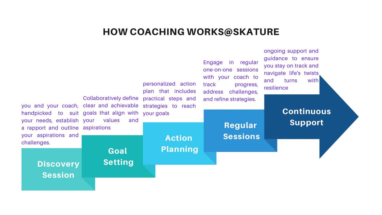 At Skature, life coaching goes beyond setting and achieving goals. We focus on holistic development, addressing key areas such as personal growth, relationships, career, and well-being.